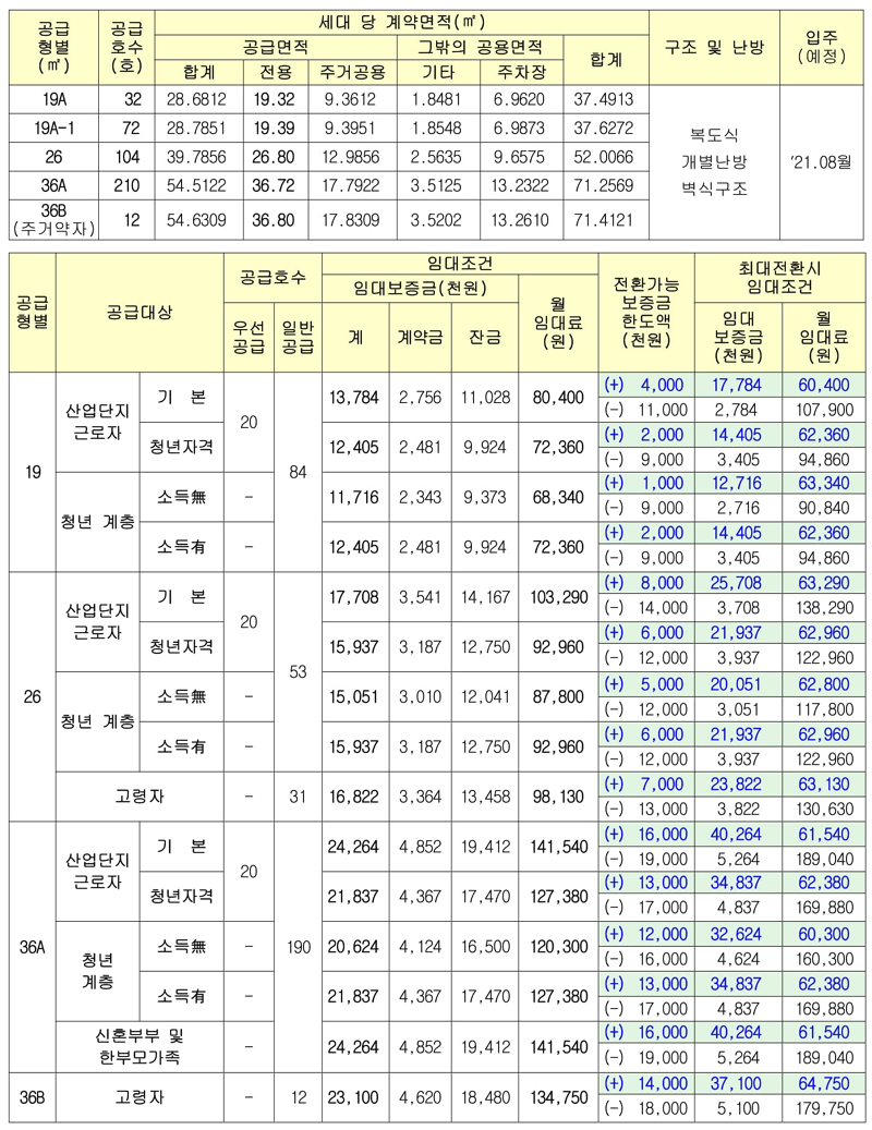 *임대보증금 및 월 임대료는 입주자 모집공고일 기준이며, 공급 대상(대학생, 청년 고령자, 주거급여 수급자, 신혼부부, 한부모), 주택 유형, 보증금 최대 전환 시 변동될 수 있습니다. 참고만 해주세요!