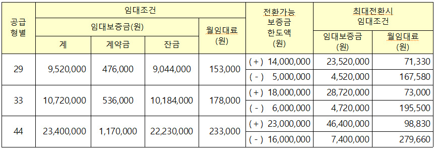 *공급 타입별 임대조건은 최근 산정된 기본 임대조건으로 모집공고 시기, 입주시기 및 계약자 조건 등에 따라 차이가 발생할 수 있으니 참고만 해주세요!